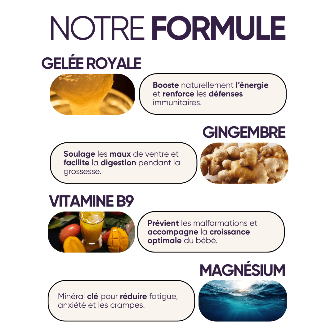 Fini les nausées, la fatigue intense et les crampes. Grow t'offre une grossesse sereine et un développement optimal pour ton bébé.
